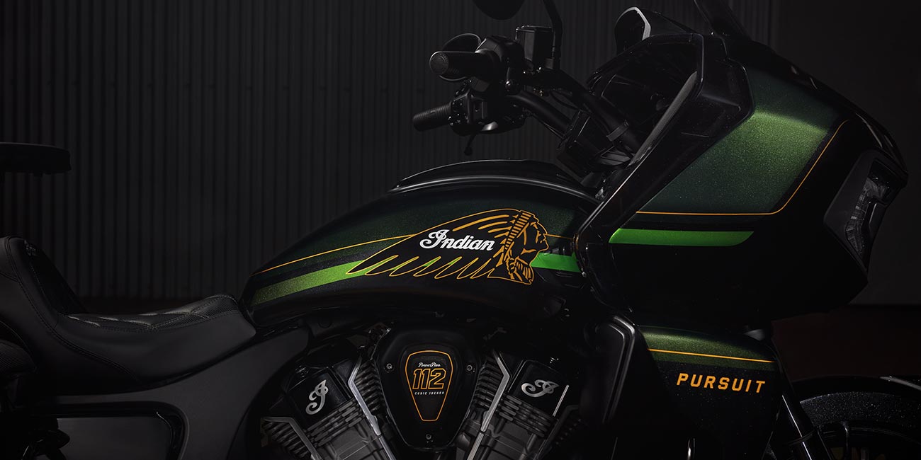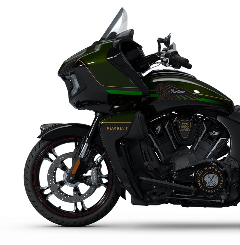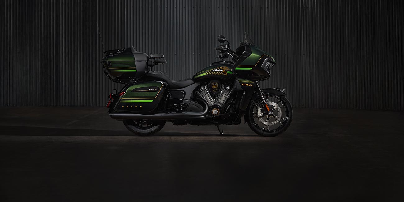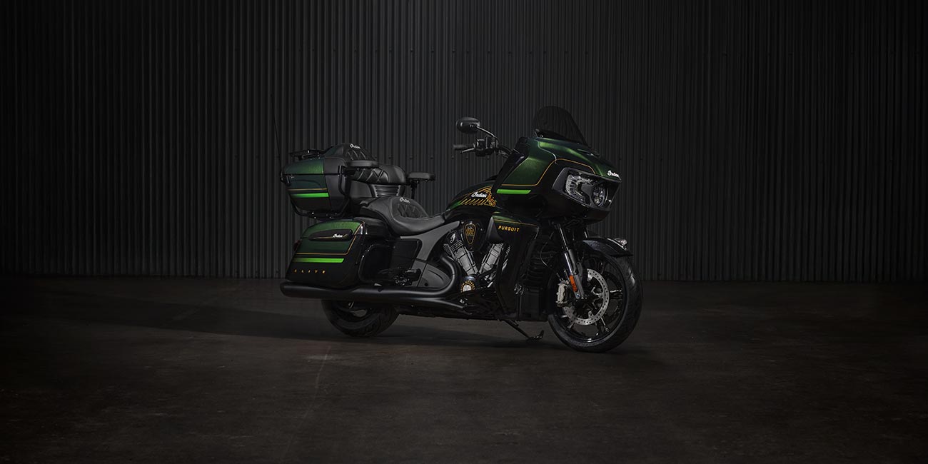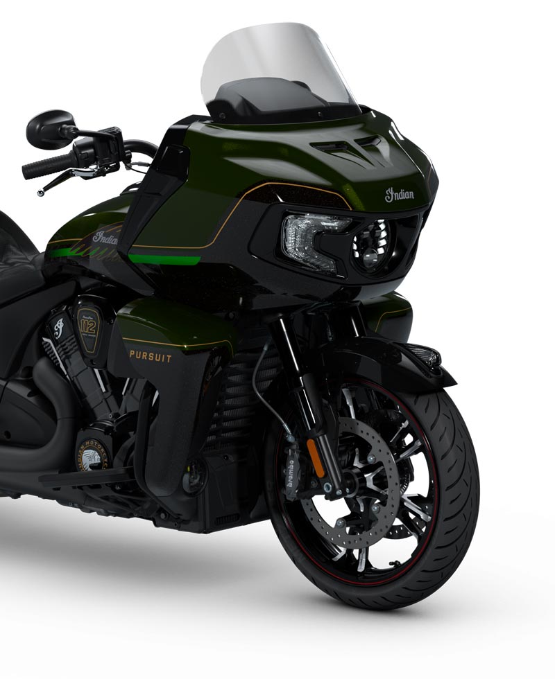 | SERIENAUSSTATTUNG | Fernverschließbare Koffer, elektrisch verstellbares Windschild, 140+ Liter Stauraum, schlüssellose Zündung, verstellbare Verkleidungsklappen, USB-Ladegerät, Reifendruckkontrollsystem (TPMS), Indian Fussbretter für Fahrer und Beifahrer, beheizbare Sitze mit grünen Nähten, beleuchtete Schalter mit beheizten Griffen, Armlehnen für den Beifahrer und Fahrscheinwerfer |